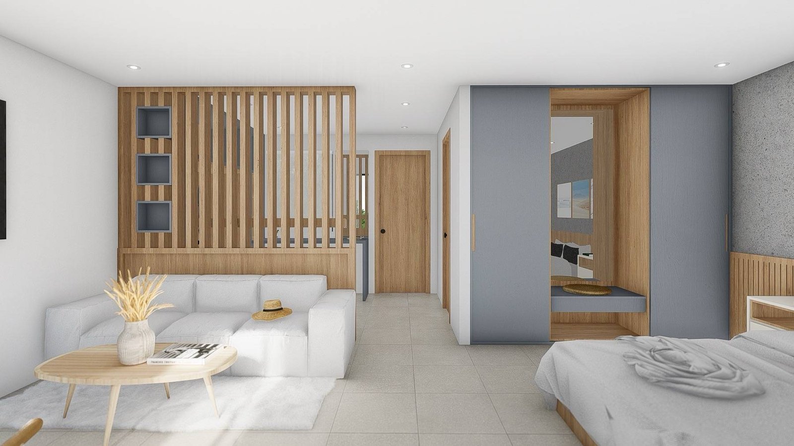 A spacious studio with soft relaxing shades, a private furnished balcony and bathroom with a shower.